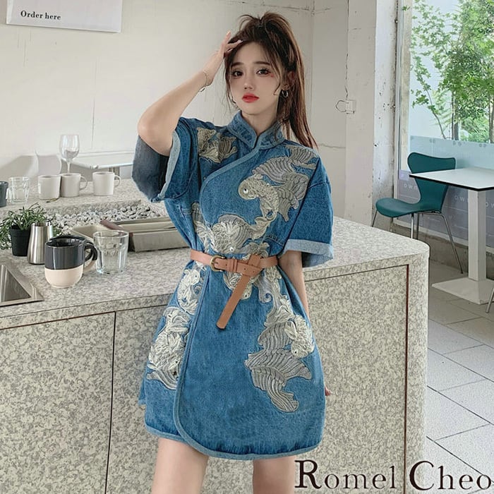 【お支払い確認後20日以内発送】デニム和柄刺繍チャイナミニワンピ デニムワンピ チャイナワンピ ミニワンピ ミニ丈 スタンドカラー オーバーサイズ ゆったり 半袖 アジアン エスニック 民族風 レディース モード系 ファッション 原宿系 青文字系 カジュアル ファッション ロメルチェオ