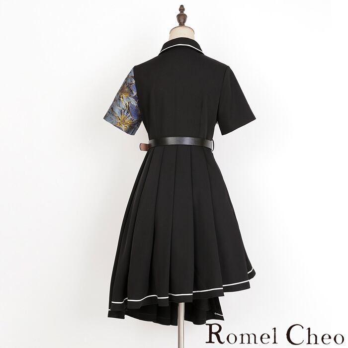 【速達配送】RomelCheo ベルト付き アシメ和柄チャイナボタンワンピース チャイナワンピ アシメワンピ 切り替え 切り替え ハイウエスト ウエストマーク 半袖 アジアン エスニック 民族風 レディース モード系 ファッション 原宿系 青文字系 カジュアル ファッション ロメルチェオ