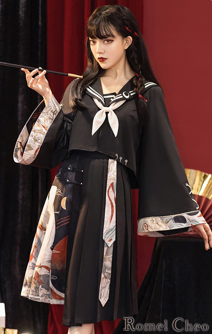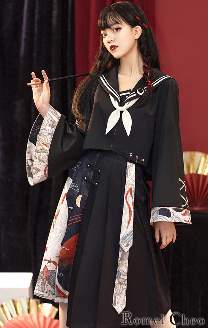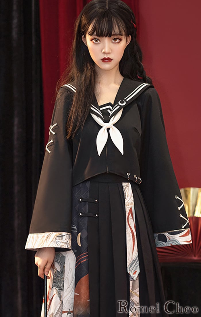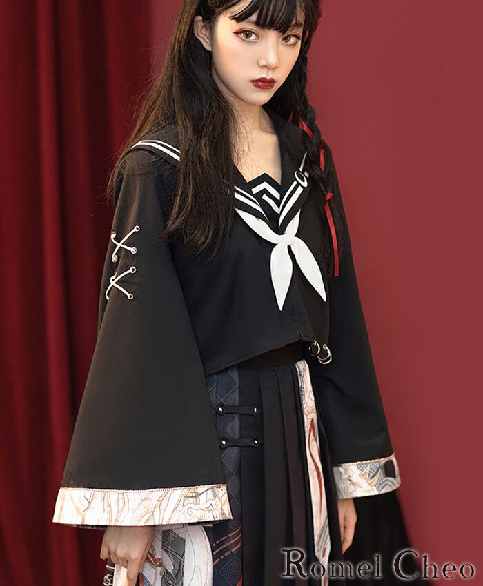 【RomelCheo】和柄セーラー服コーデ セーラーブラウス セーラーカラー 和柄ブラウス フレアスリーブ 長袖 アシメスカート ひざ丈 アジアン エスニック 民族風 レディース モード系 ファッション 原宿系 青文字系 カジュアル ファッション ロメルチェオ