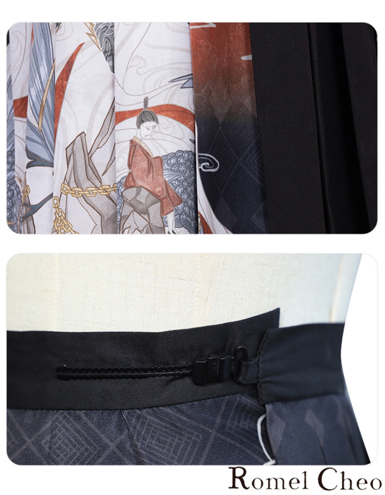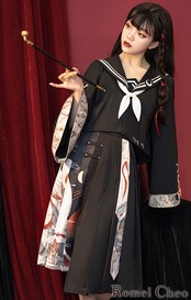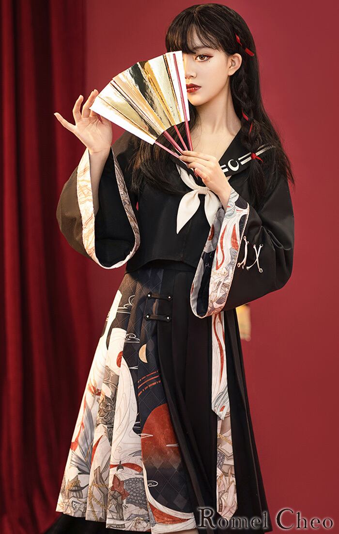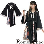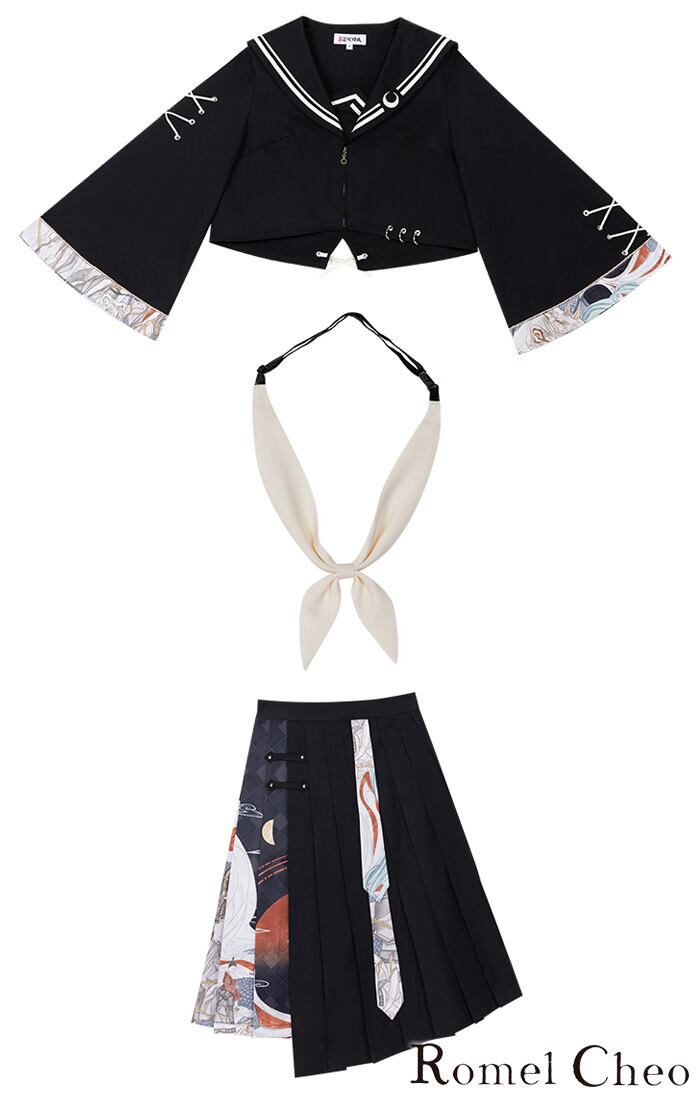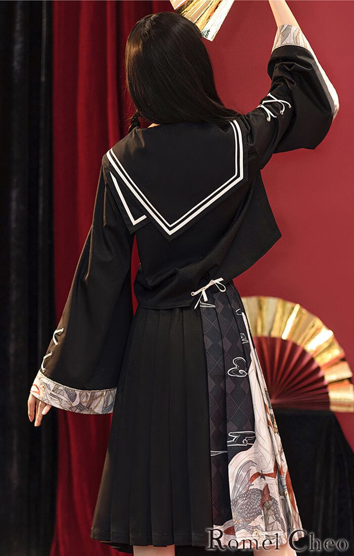 【RomelCheo】和柄セーラー服コーデ セーラーブラウス セーラーカラー 和柄ブラウス フレアスリーブ 長袖 アシメスカート ひざ丈 アジアン エスニック 民族風 レディース モード系 ファッション 原宿系 青文字系 カジュアル ファッション ロメルチェオ