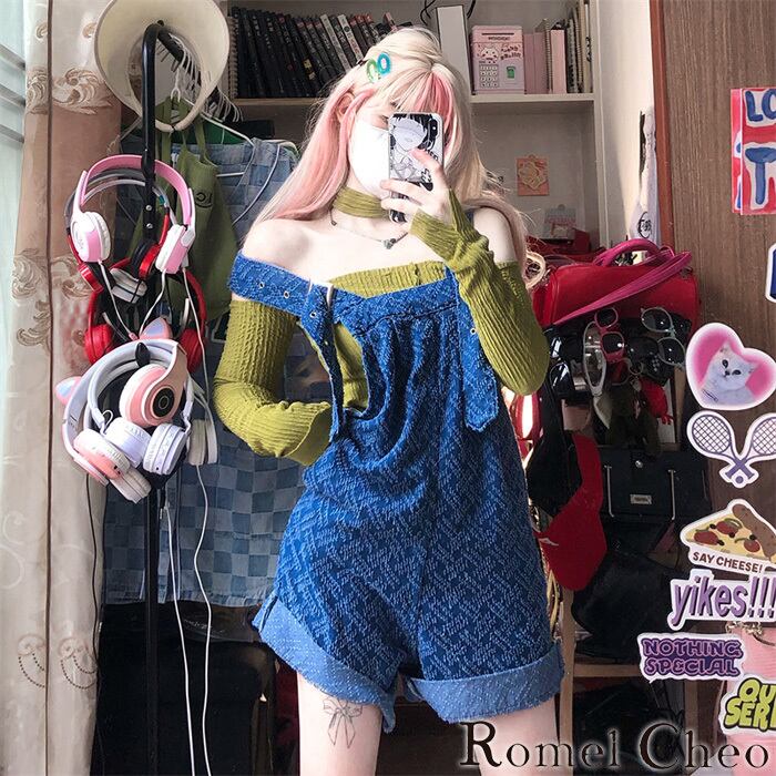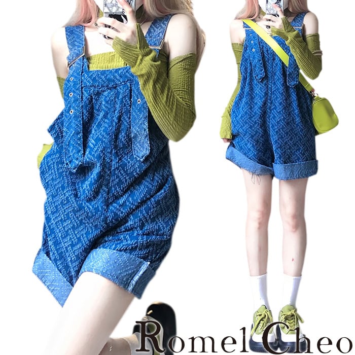 【お支払い確認後20日以内発送】RomelCheo ハーフサロペット 総柄 ハーフオーバーオール オールインワン オーバーオールパンツ ワイドレッグ ルーズ ゆったり ショーツ ボトムス カジュアル 大人カジュアル レディース モード系 ストリート 原宿系 青文字系 ファッション ロメルチェオ