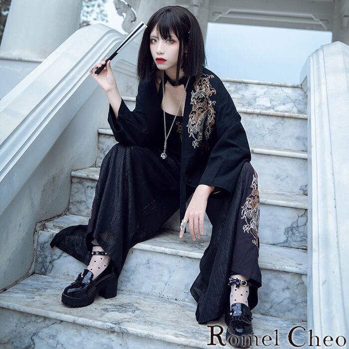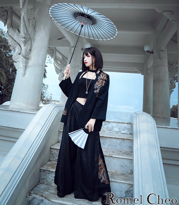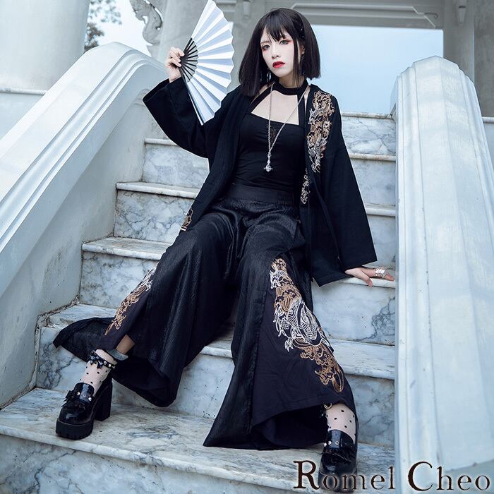 【お支払い確認後20日以内発送】RomelCheo レイヤード風双龍刺繍ワイドパンツ ワイドレッグパンツ ボリュームパンツ ガウチョ スカンツ スカーチョ アジアン エスニック 個性的 民族風 和風 メンズ レディース ユニセックス モード系 ストリート 原宿系 青文字系 ファッション ロメルチェオ