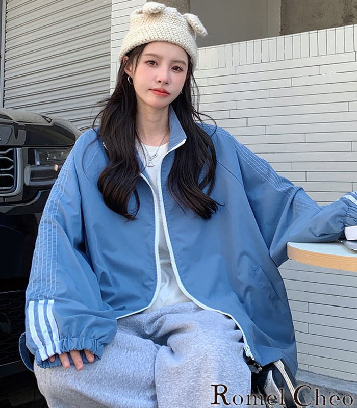 【お支払い確認後20日以内発送】RomelCheo ラインビッグブルゾン ジップアップブルゾン サイドラインジャケット ナイロンブルゾン ナイロンジャケット ジャンパー ブルゾン オーバーサイズ ゆったり ルーズシルエット 長袖 羽織 カジュアル レディース モード系 ストリート 原宿系 青文字系