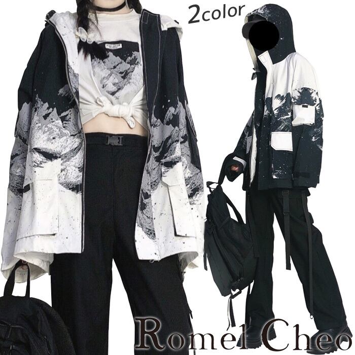 【お支払い確認後20日以内発送】RomelCheo 雪山柄 マウンテンパーカー マンパ オーバーサイズジャケット フーディージャケット ジャケット ボリューム袖 ドロップショルダー 長袖 アウター アウトドア 個性的 レディース モード系 ストリート 原宿系 青文字系 ファッション ロメルチェオ