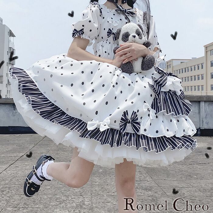 【お支払い確認後20日以内発送】RomelCheo ロリータリボンドットワンピース ロリータワンピ ドットワンピ リボンワンピ ハイウエスト パフスリーブ 半袖 ひざ丈 Aライン クラロリ ゆめかわ レディース モード系 ファッション 森ガール 原宿系 青文字系 カジュアル ファッション ロメルチェオ