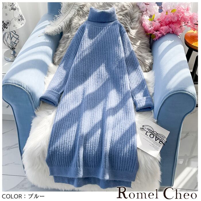 【お支払い確認後20日以内発送】RomelCheo Aライン コクーン ニットワンピ タートルネックワンピ プルオーバー ロングワンピ ゆったり ルーズシルエット ドロッププショルダー 長袖 膝上丈 ミニ丈 ハイカラー レディース モード系 ストリート 原宿系 青文字系 ファッション ロメルチェオ