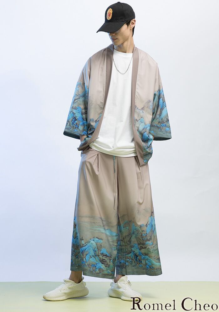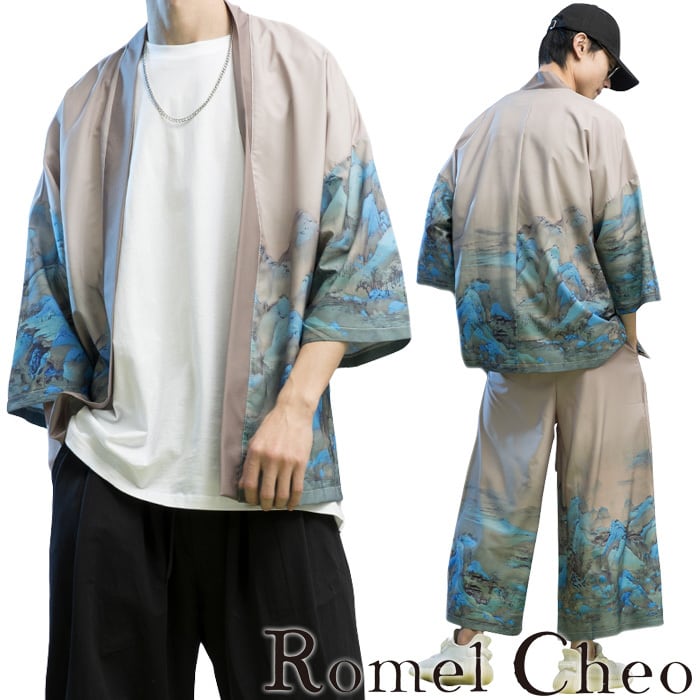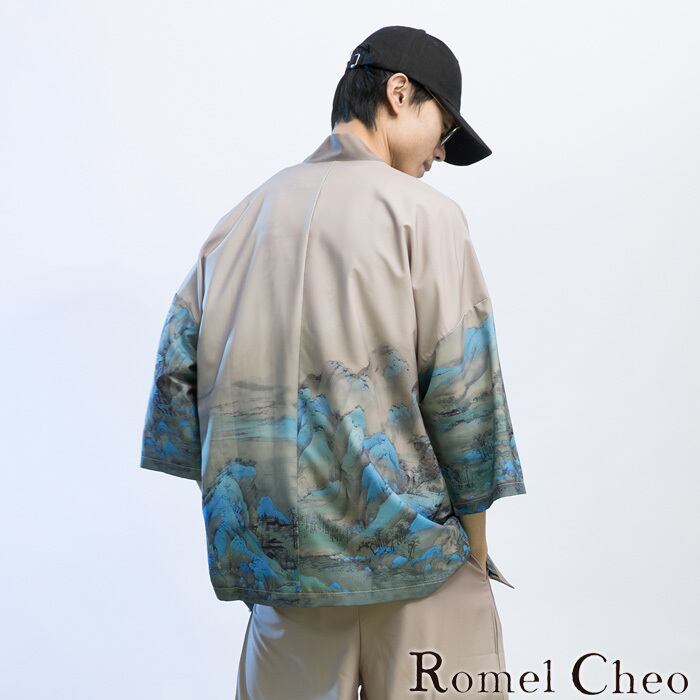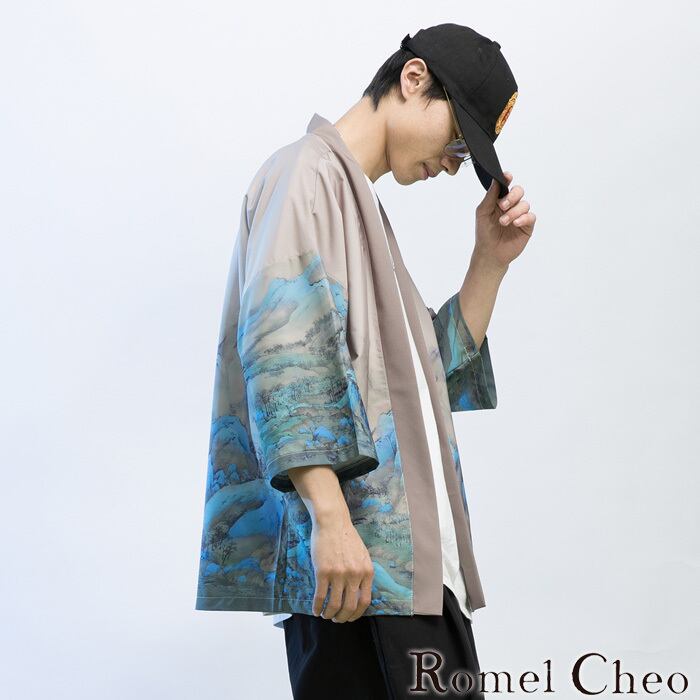 【お支払い確認後20日以内発送】RomelCheo 和柄 羽織 カーディガン 羽織カーディガン カーディガンジャケット ドロップショルダー 7分袖 ライトアウター 和風 エスニック アジアン 和装 和式トップス 個性的 はっぴ メンズ モード系 ストリート 原宿系 青文字系 ファッション ロメルチェオ