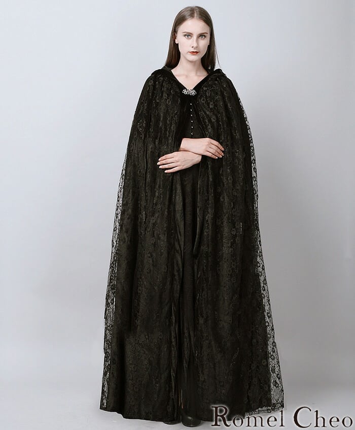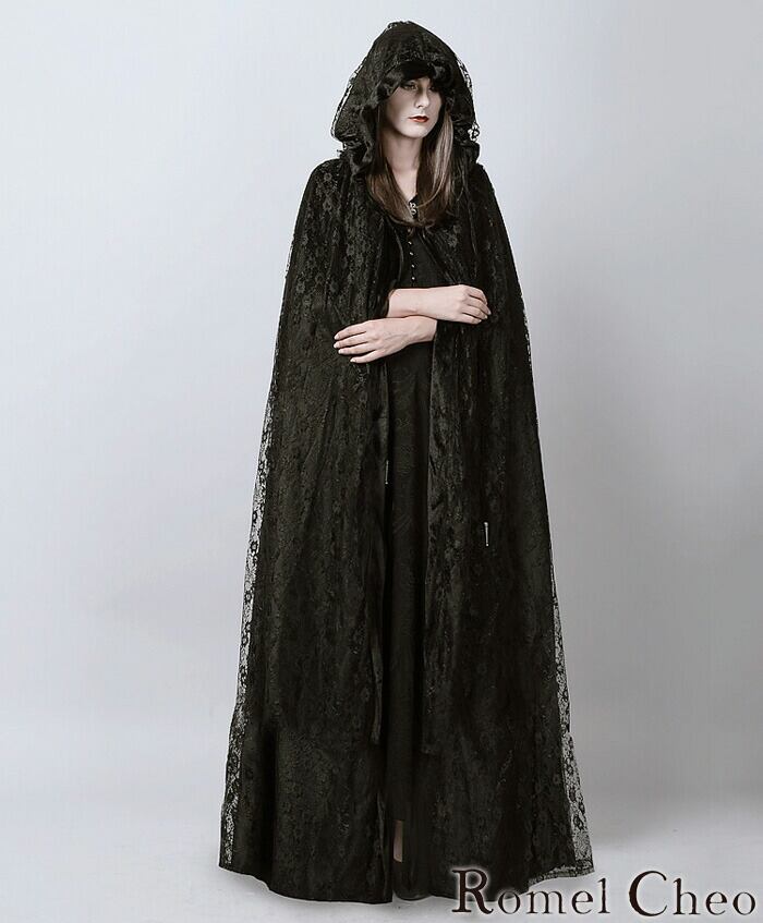 【お支払い確認後20日以内発送】RomelCheo ダークウィザードレースマキシマント ウィザードコート ケープコート レースマント ブラックマント フード付き ロング丈 ダークファッション 羽織り 個性的 ゴス ゴシック レディース モード系 ストリート 原宿系 青文字系 ファッション ロメルチェオ