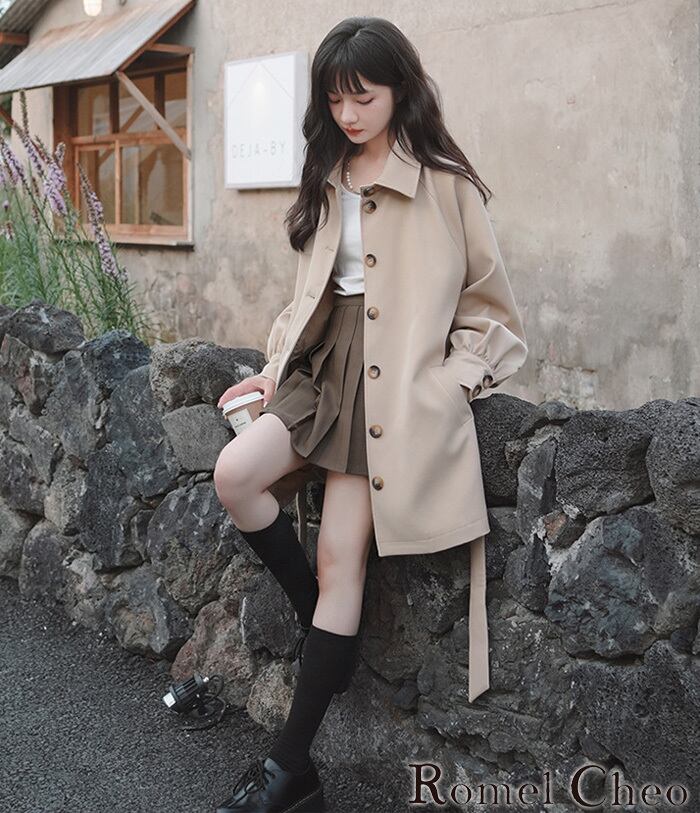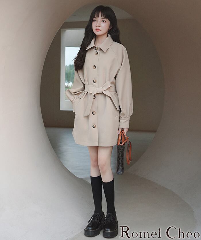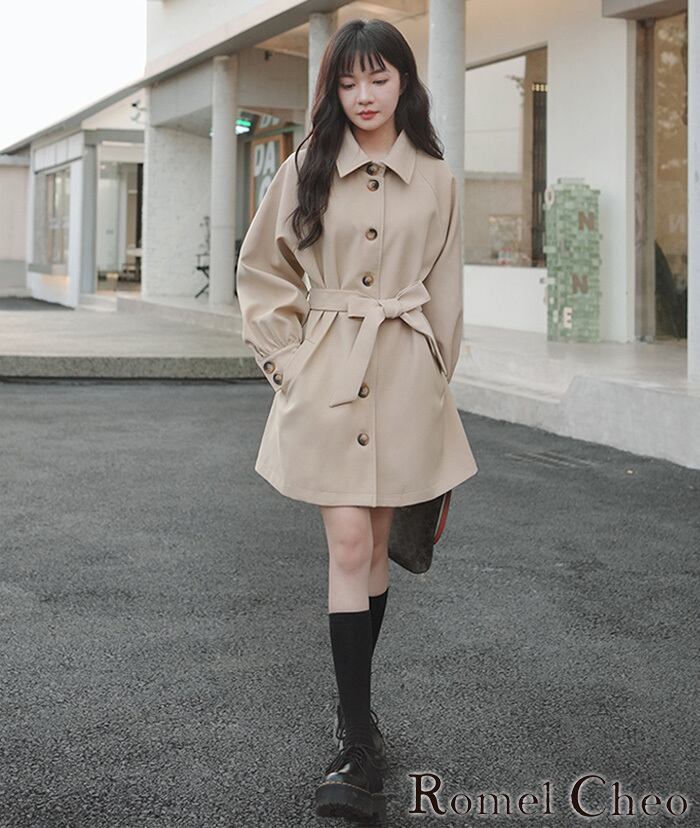 【お支払い確認後20日以内発送】 RomelCheo オルチャン レディース ミディアム丈 コート 秋 冬 春 トレンチコート ボリューム袖 ミドル丈 ゆったり 羽織り アウター ベルト付き 無地 シンプル 大人カジュアル レディース モード系 ストリート 原宿系 青文字系 ファッション ロメルチェオ