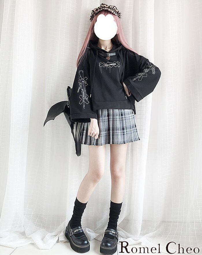 【お支払い確認後20日以内発送】RomelCheo バックスリット病みかわライフルパーカー プルオーバーパーカー グラフィックパーカー デザインパーカー ボリューム袖 パンク ロック ロリータ レディース モード系 ファッション 森ガール 原宿系 青文字系 カジュアル ファッション ロメルチェオ