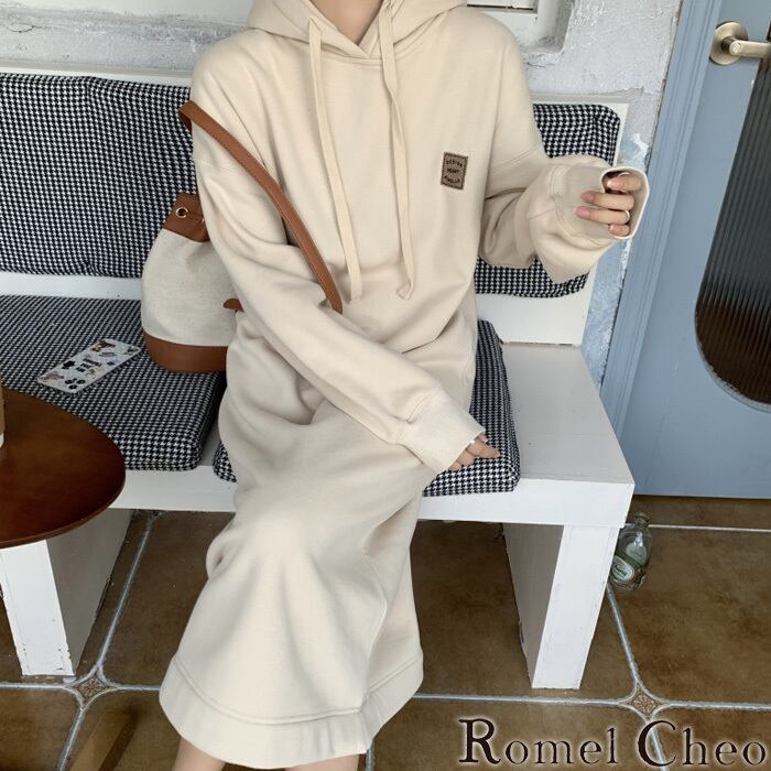 【お支払い確認後20日以内発送】RomelCheo ワンポイント ロングパーカー パーカーワンピース プルオーバーパーカー オーバーサイズ ゆったり ひざ丈 ミディ丈 リラックス 大人カジュアル レディース モード系 ファッション 森ガール 原宿系 青文字系 カジュアル ファッション ロメルチェオ