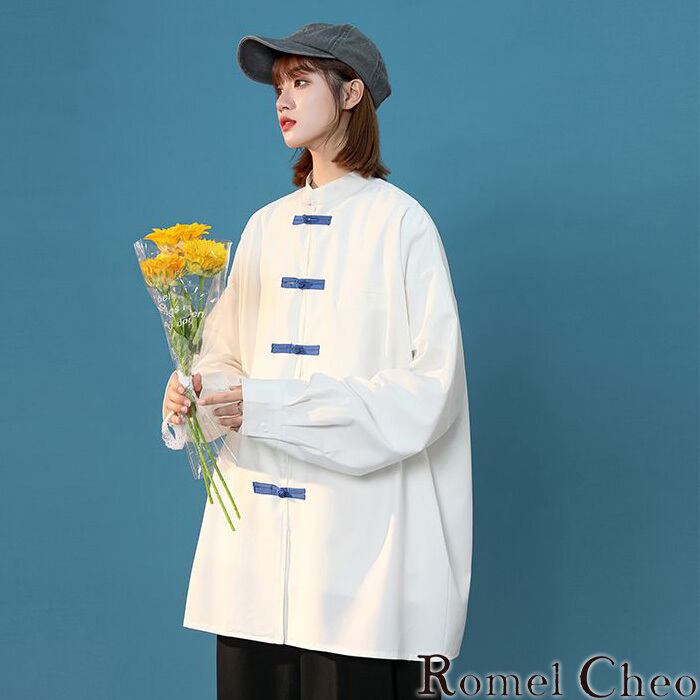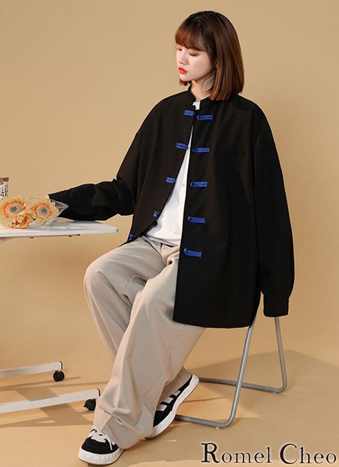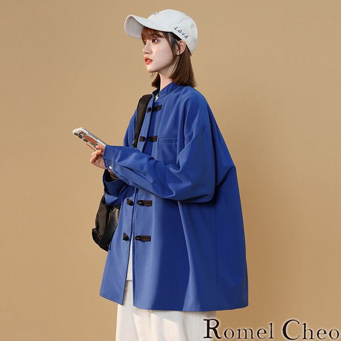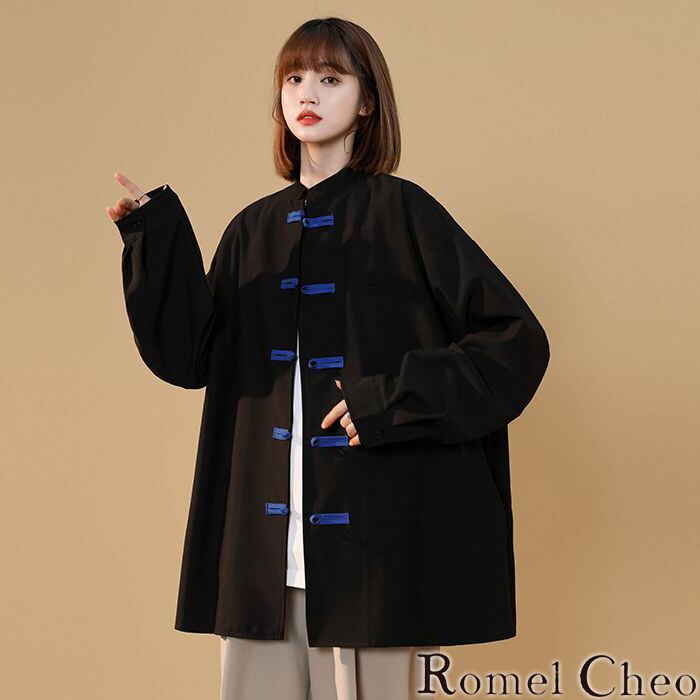 【お支払い確認後20日以内発送】RomelCheo チャイナダボシャツジャケット チャイナジャケット チャイナボタンジャケット カバーオール チャイナシャツ チャイナ服 アジアン レディース ストリート モード系 ファッション 森ガール 原宿系 青文字系 カジュアル ファッション ロメルチェ