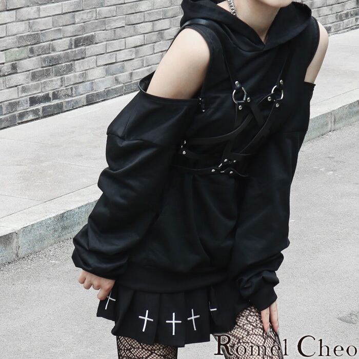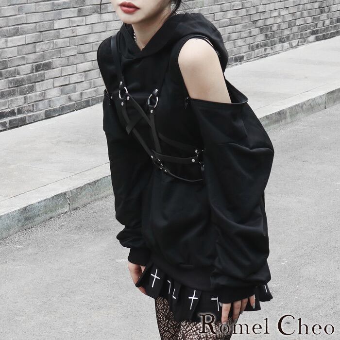 【お支払い確認後20日以内発送】RomelCheo パンクストラップ付きオフショルジップパーカー オフショルダーパーカー プルオーバー オープンショルダー オプショル 肩出し ゴス レディース ストリート モード系 ファッション 森ガール 原宿系 青文字系 カジュアル ファッション ロメルチェオ