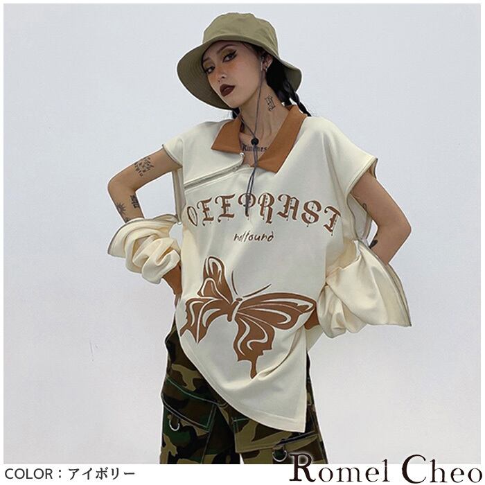 【お支払い確認後20日以内発送】RomelCheo バタフライアシメジップ襟付きトレーナー プルオーバースウェット ジップアップスウェット デザインスウェット オーサイズ トレーナー レディース ストリート モード系 ファッション 森ガール 原宿系 青文字系 カジュアル ファッション ロメルチェオ
