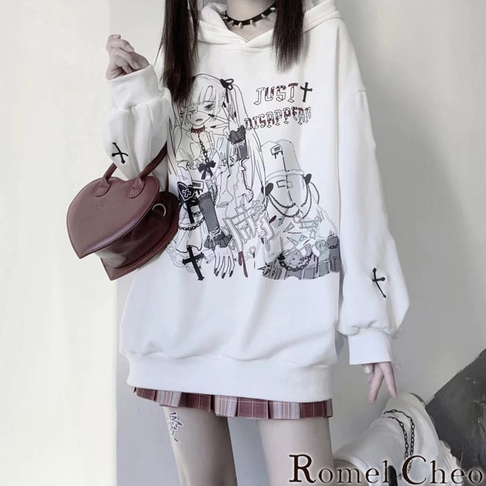 【お支払い確認後20日以内発送】RomelCheo 原宿風イラスト裏起毛パーカー プルオーバーパーカー グラフィックパーカー オーバーサイズ 長袖 パンク ロック 病み系 ロリータ ゴス レディース ストリート モード系 ファッション 森ガール 原宿系 青文字系 カジュアル ファッション ロメルチェオ