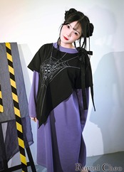 【お支払い確認後20日以内発送】RomelCheo ブラックパープルウェブスパイダーワンピース デザインワンピ レイヤードワンピース フェイクツーピース 長袖 Aライン ミディ丈 ひざ丈 レディース ストリート モード系 ファッション 森ガール 原宿系 青文字系 カジュアル ファッション ロメルチェオ