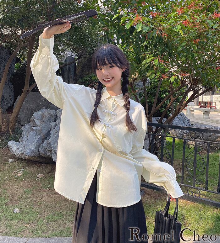【お支払い確認後20日以内発送】RomelCheo ルーズレトロチャイナシャツ チャイナボタンシャツ チャイナ服 漢服 ブラウス オーバーサイズ ゆったり アジアン エスニック レディース モード系 ストリート 森ガール 個性的 原宿系 青文字系 カジュアル ファッション ロメルチェオ