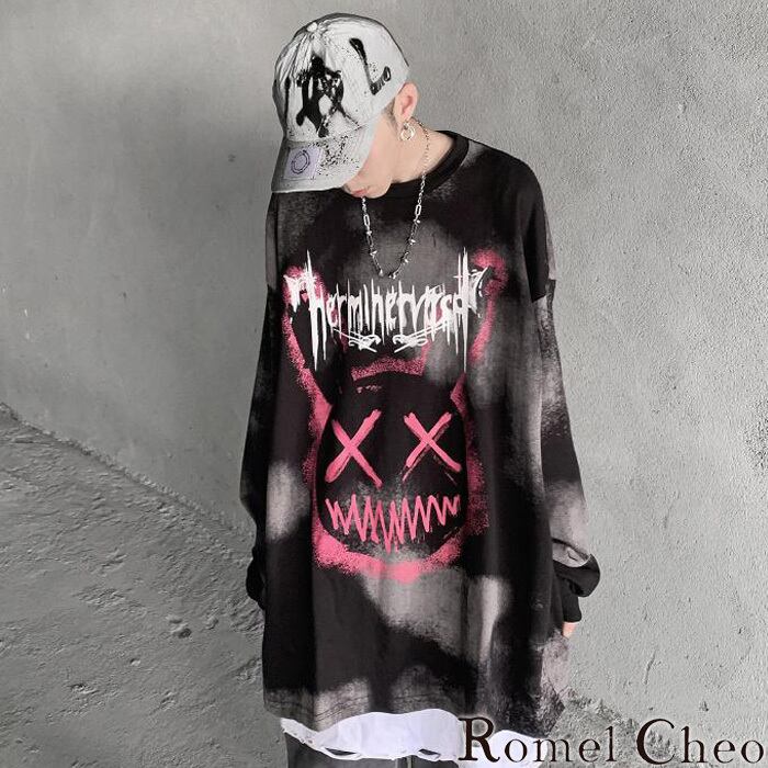 【お支払い確認後20日以内発送】RomelCheo デビルラビットダイタイ長袖Tシャツ ロンT グラフィックロンT オーバーサイズ ルーズ ゆったり 長袖 パンク ロック メンズ レディース ユニセックス ストリート モード系 森ガール 個性的 原宿系 青文字系 カジュアル ファッション ロメルチェオ