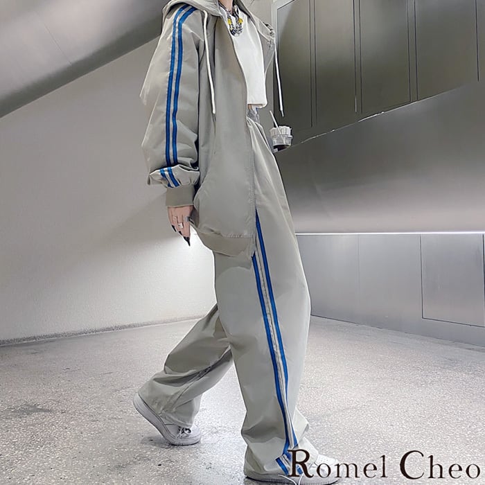 【RomelCheo】 二本ライン ジャージセット トラックジャケット トラックパンツ サイドラインジャージ セットアップ オバーサイズ ゆったり おしゃれジャージ レディース ストリート モード系 森ガール 個性的 原宿系 青文字系 カジュアル ファッション ロメルチェオ