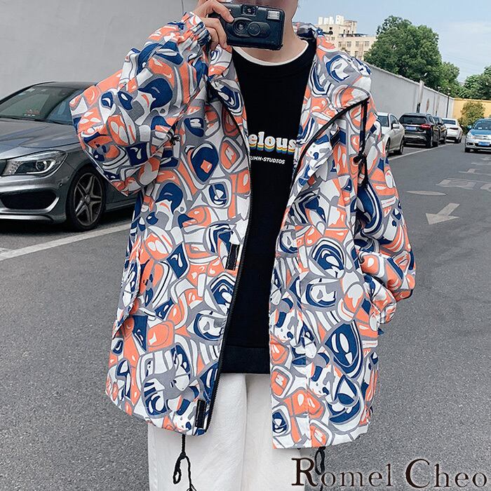 【お支払い確認後20日以内発送】 RomelCheo アメカジストリートウインドブレーカー ジップアップジャケット ナイロンパーカー ナイロンブルゾン フードブルゾン オーバーサイズ ゆったり アウター 羽織り 総柄 メンズ モード系 ストリート 原宿系 青文字系 ファッション ロメルチェ