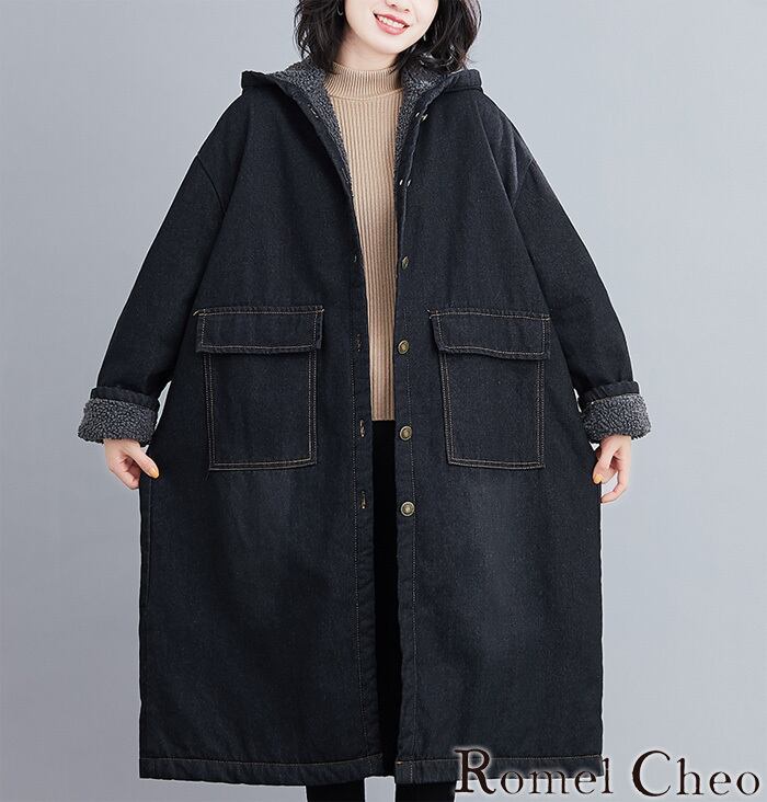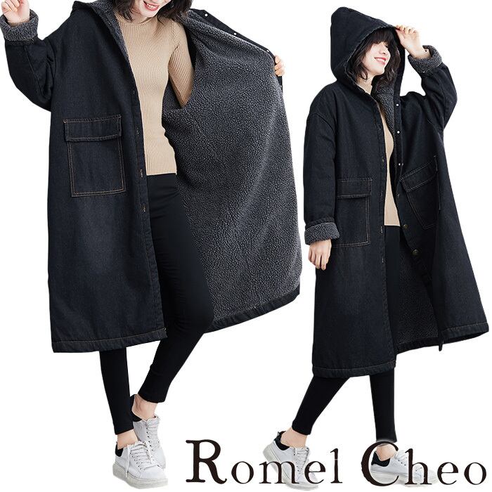 【お支払い確認後20日以内発送】 RomelCheo 裏起毛 デニムコート 裏ボアコート ロングコート ボアフードコート フード付きコート ビッグポケット ランチコート オーバーサイス ゆったり アウター ひざ丈 長袖 羽織り レディース 個性的 原宿系 青文字系 カジュアル ファッション ロメルチェオ