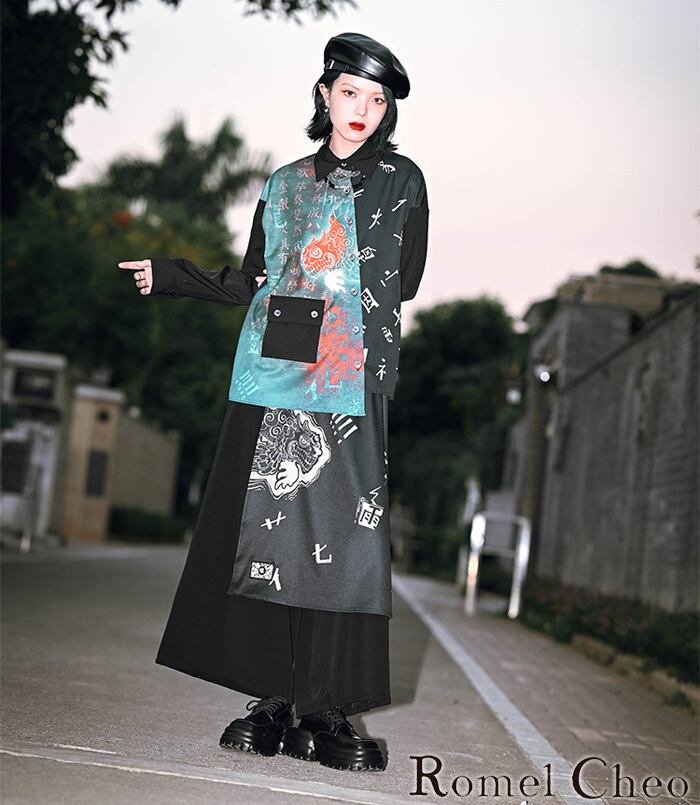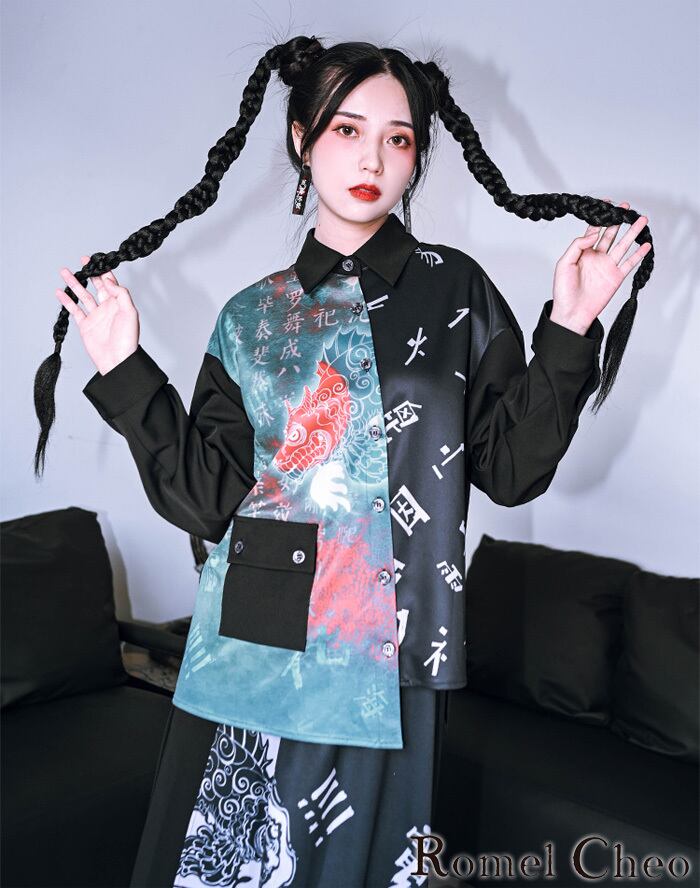 【お支払い確認後20日以内発送】RomelCheo アシメデザイン チャイナ柄シャツ アシメシャツ デザインシャツ グラフィックシャツ プリントシャツ クレイジーパターン シャツ 長袖 エスニック ストリート モード系 森ガール 個性的 原宿系 青文字系 カジュアル ファッション ロメルチェオ