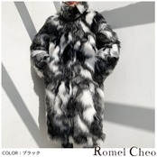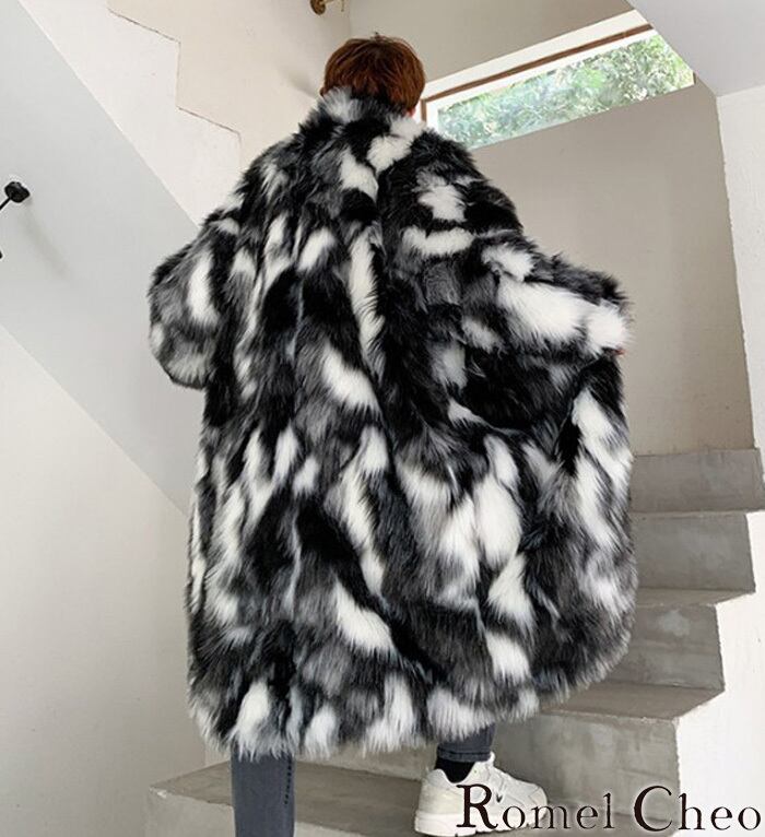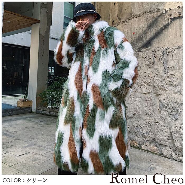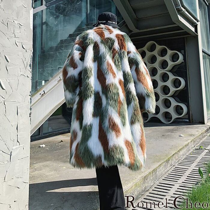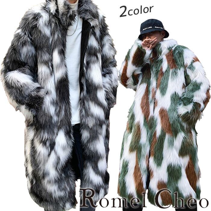 【お支払い確認後20日以内発送】 RomelCheo 迷彩シャギージップアップコート ロングコート デザインコート オーバーサイズコート ファーコート ボリュームコート ひざ丈 羽織り 総柄 迷彩 大人カジュアル メンズ 個性的 モード系 ストリート 原宿系 青文字系 ファッション ロメルチェオ