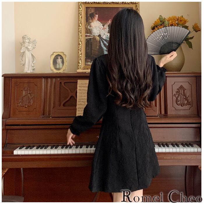 【お支払い確認後20日以内発送】RomelCheo リボンチャイナワンピース チャイナボタンワンピ チャイナドレス チャイナ服 スリットワンピ ギャザー袖 長袖 ミニ丈 ひざ下丈 ミディ丈 アジアン エスニック フェミニン レディース 個性的 原宿系 青文字系 カジュアル ファッション ロメルチェオ