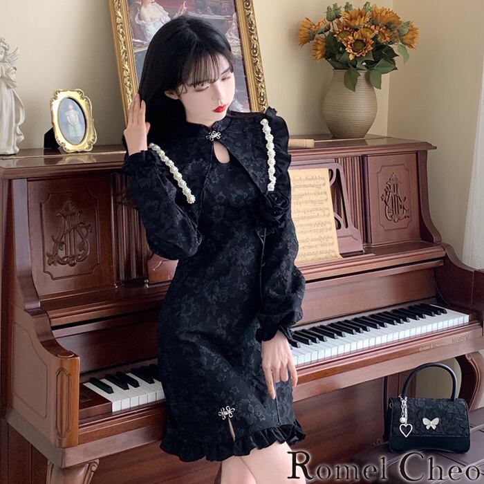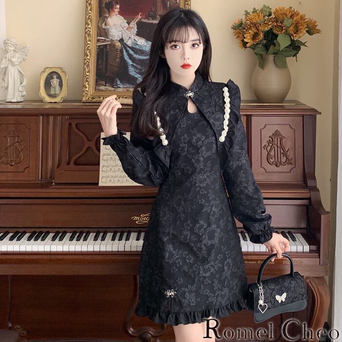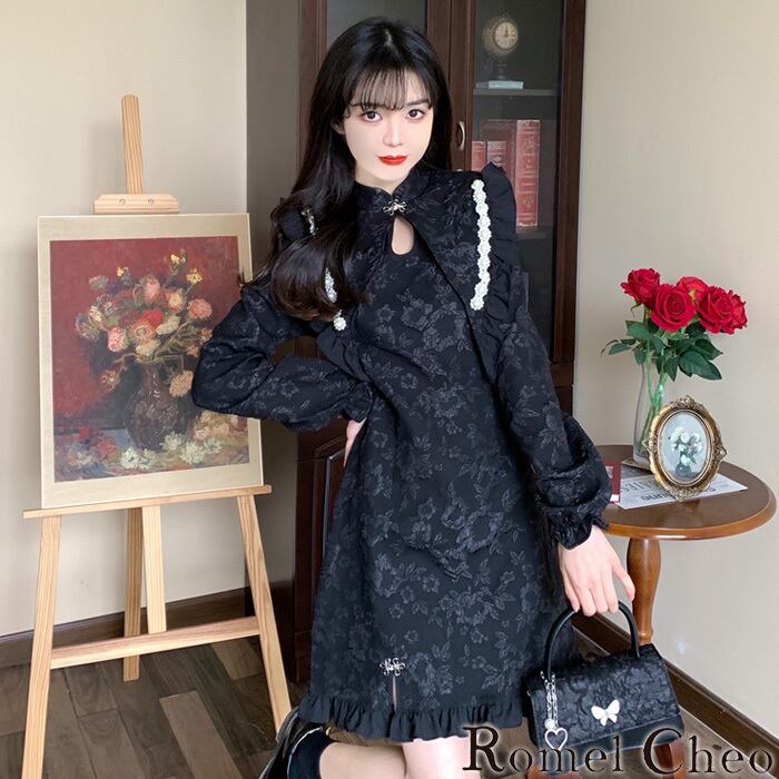 【お支払い確認後20日以内発送】RomelCheo ビッグラペルフラワーチャイナミニワンピ ビッグカラーワンピ フリルワンピ チャイナボタンワンピ チャイナドレス チャイナ服 長袖 ミニ丈 アジアン エスニック フェミニン レディース 個性的 原宿系 青文字系 カジュアル ファッション ロメルチェオ