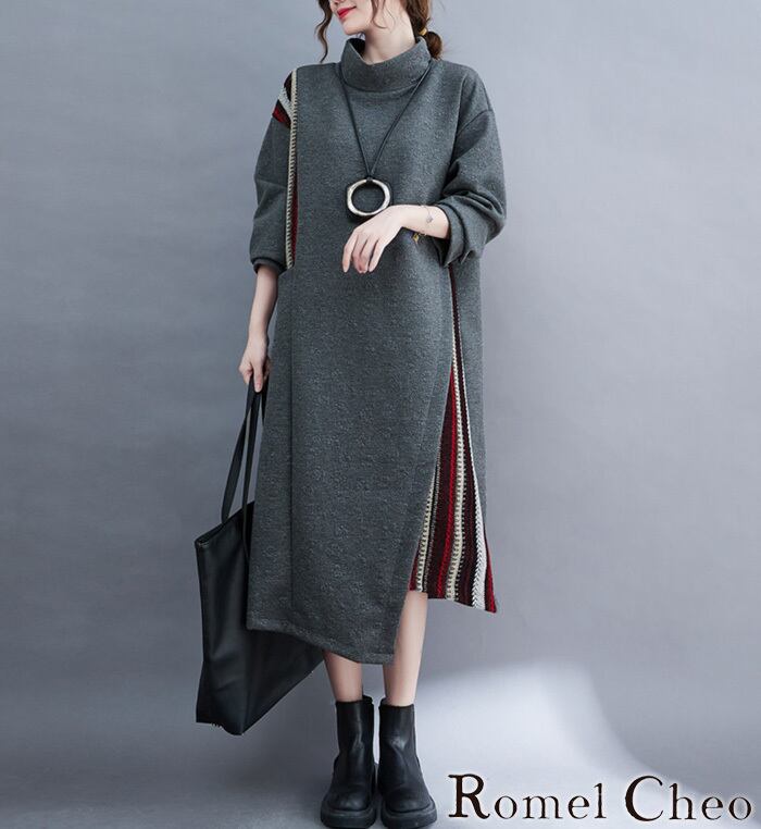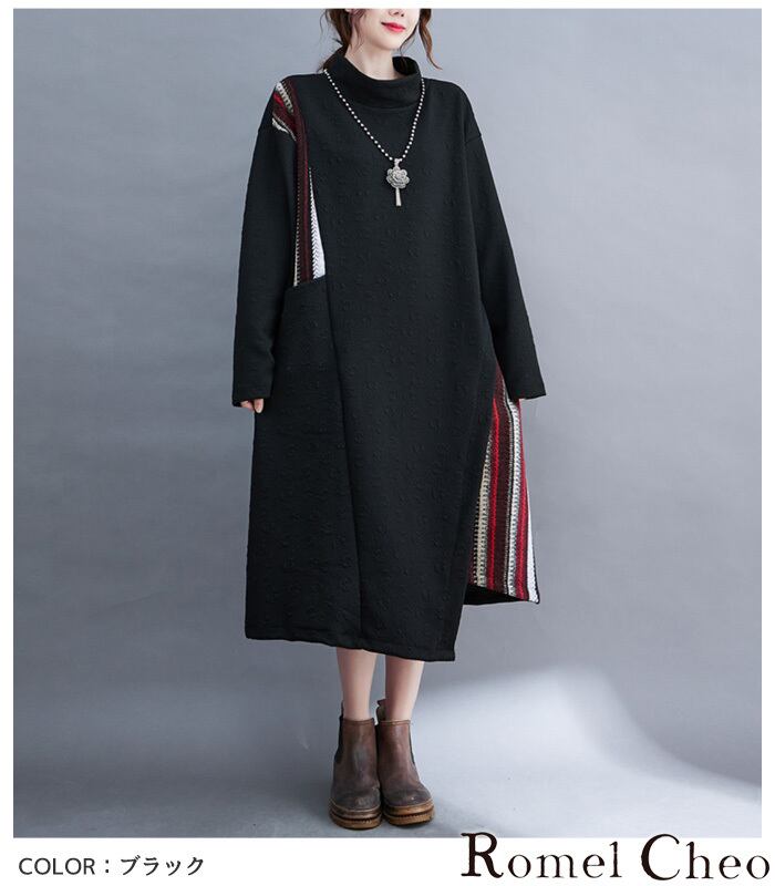 【お支払い確認後20日以内発送】RomelCheo エスニックストライプハイネックワンピース モックネックワンピース アシメデザインワンピ 切り替え 長袖 Aライン ゆったり 総柄 ミモレ丈 エスニック フェミニン レディース 個性的 原宿系 青文字系 カジュアル ファッション ロメルチェオ