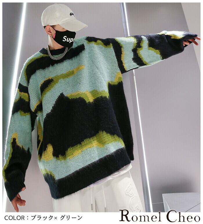 【お支払い確認後20日以内発送】RomelCheo タイダイカモフラージュセーター タイダイ柄ニット カモフラ柄ニット デザインニット ルーズニット ドロップショルダー 総柄 長袖 オーバーサイズ ゆったり メンズ カジュアル 個性的 モード系 ストリート 原宿系 青文字系 ファッション ロメルチェオ