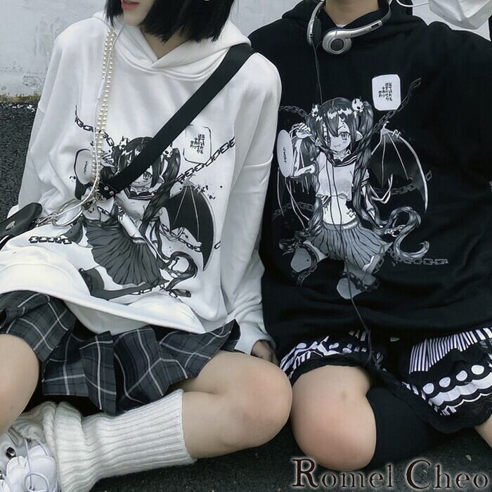 【お支払い確認後20日以内発送】RomelCheo 裏起毛アニメ風イラストパーカー プルオーバーパーカー グラフィックパーカー オーバーサイズパーカー ルーズシルエット ゆったり ロリータ 病み系 病みかわ ゴスロリ レディース 個性的 原宿系 青文字系 カジュアル ファッション ロメルチェオ