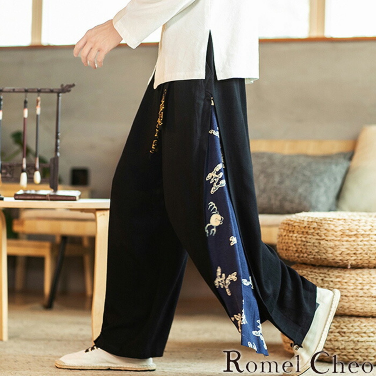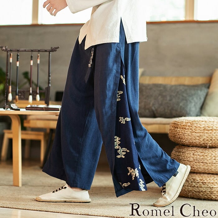 【お支払い確認後20日以内発送】RomelCheo 和柄切替麻混ワイドパンツ ワイドレッグパンツ ワイドパンツ 切り替えパンツ ガウチョパンツ ロングパンツ オーバーサイズ ルーズ デザインパンツ アジアン 中華風 メンズ モード系 ストリート 原宿系 青文字系 サロン系 ファッション ロメルチェオ