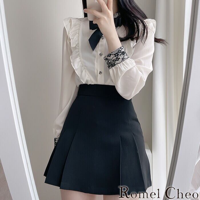 【お支払い確認後20日以内発送】RomelCheo 量産型カメリアリボンブラウス フリルブラウス 切り替えブラウス デザインブラウス シャツ デザインシャツ レース袖 長袖 フェミニン ガーリー 大人可愛い レディース 個性的 原宿系 青文字系 カジュアル ファッション ロメルチェオ