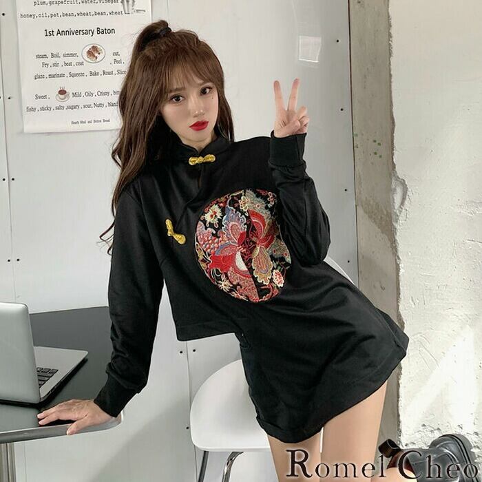 【お支払い確認後20日以内発送】RomelCheo 変形カット刺繍チャイナシャツ ショートチャイナシャツ アシメチャイナシャツ チャイナボタン 変形シャツ 刺繍シャツ 長袖 アジアン エスニック フェミニン レディース 個性的 原宿系 青文字系 カジュアル ファッション ロメルチェオ