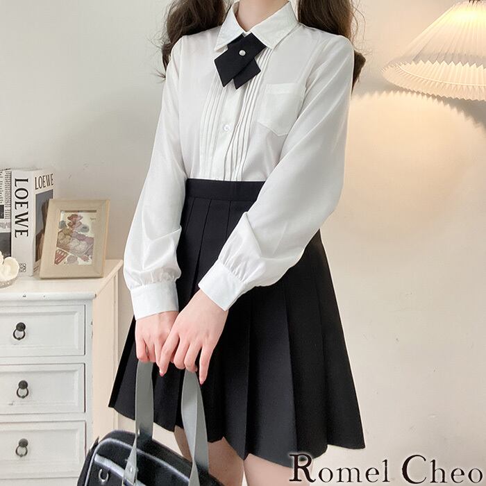 【お支払い確認後20日以内発送】RomelCheo リボンタイタックプリーツ長袖シャツ プリーツシャツ ポインテッドカラーシャツ デザインブラウス シャツ デザインシャツ 長袖 フェミニン ガーリー クラロリ 大人可愛い レディース 個性的 原宿系 青文字系 カジュアル ファッション ロメルチェオ