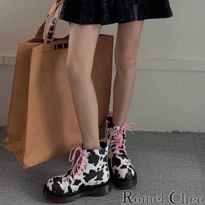 【お支払い確認後20日以内発送】RomelCheo 牛柄ブーツ レースアップブーツ ショートブーツ 編み上げブーツ アニマル柄 COW柄 ワークブーツ ラバーソール カジュアル ガーリー 可愛い おしゃれ 韓国ファッション レディース モード系 ストリート 原宿系 青文字系 ファッション ロメルチェオ