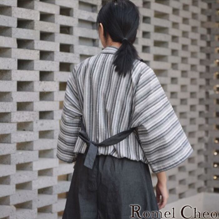 【お支払い確認後20日以内発送】RomelCheo 和風 羽織りシャツ ストライプ柄 浴衣 和風シャツ 着物風カーディガン ストライプシャツ カーディガン シャツカーデ 9分袖 和モダン レディース モード系 ファッション 原宿系 青文字系 個性的 カジュアル ファッション ロメルチェオ