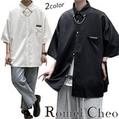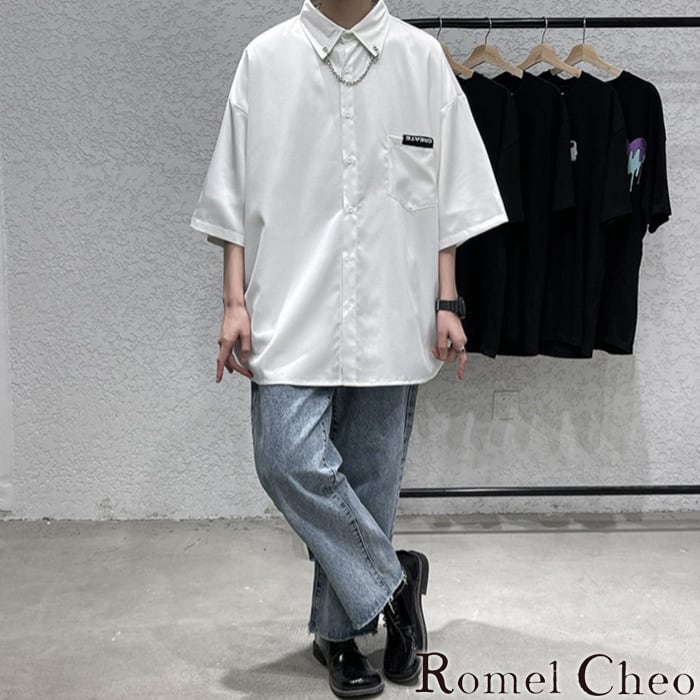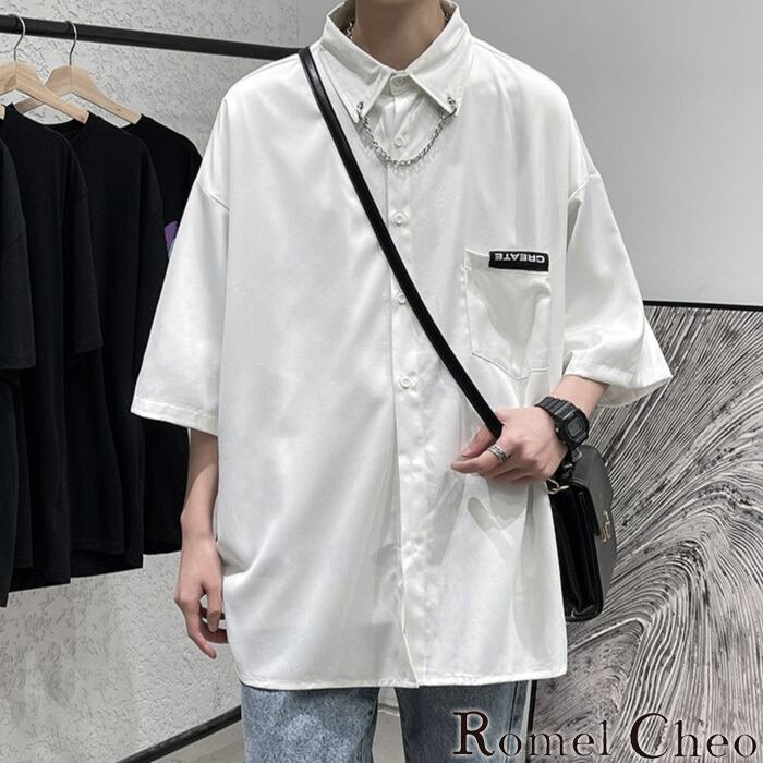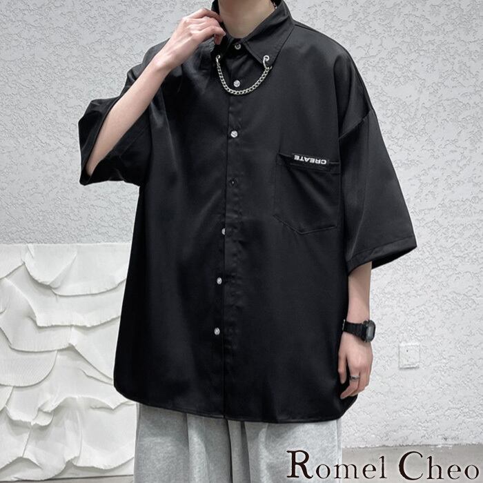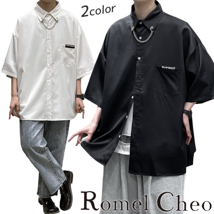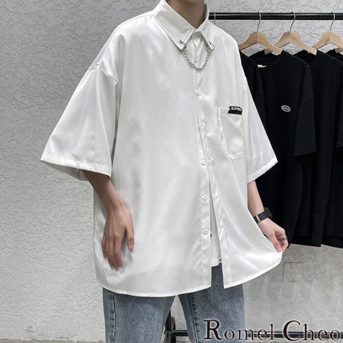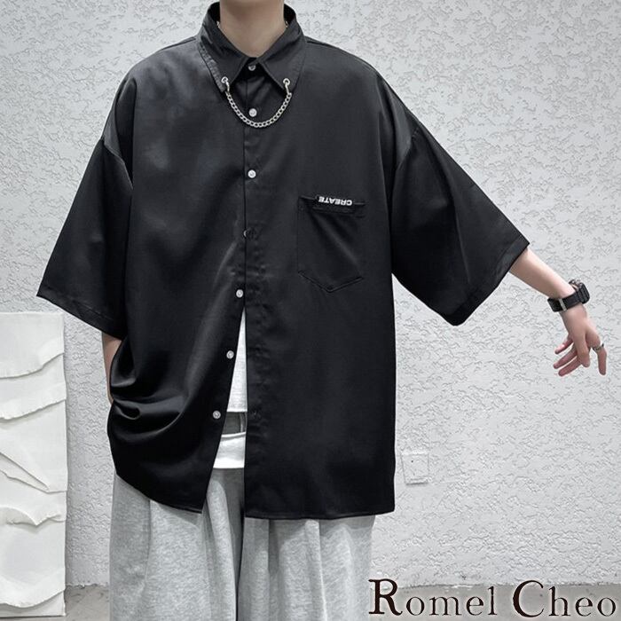 【お支払い確認後20日以内発送】RomelCheo チェーン付き 韓国ストリートシャツ 5分丈 オーバーサイズシャツ ルーズシャツ ドロップショルダー デザインシャツ 半袖シャツ メンズ ストリート モード系 ファッション 原宿系 青文字系 サロン系 個性的 カジュアル ファッション ロメルチェオ