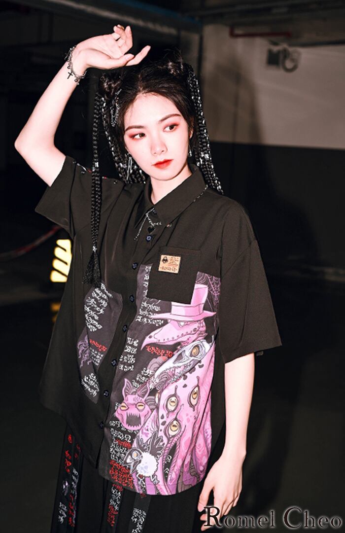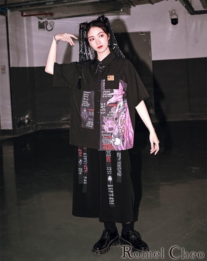 【お支払い確認後20日以内発送】RomelCheo アシンメトリー 妖怪柄シャツ アシメシャツ オーバーサイズシャツ グラフィックシャツ ルーズシャツ ドロップショルダー 半袖シャツ レディース モード系 ストリート ファッション 原宿系 青文字系 個性的 カジュアル ファッション ロメルチェオ