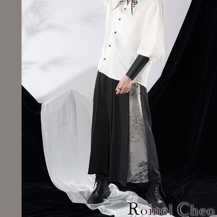 【お支払い確認後20日以内発送】RomelCheo 和柄 ワイドパンツ ワイドレッグパンツ ワイドパンツ ガウチョパンツ 切り替えパンツ レトロモダン モノトーン シンプル カジュアル アジアン メンズ レディース ユニセックス 個性的 モード系 ストリート 原宿系 青文字系 ファッション ロメルチェオ