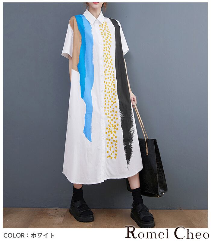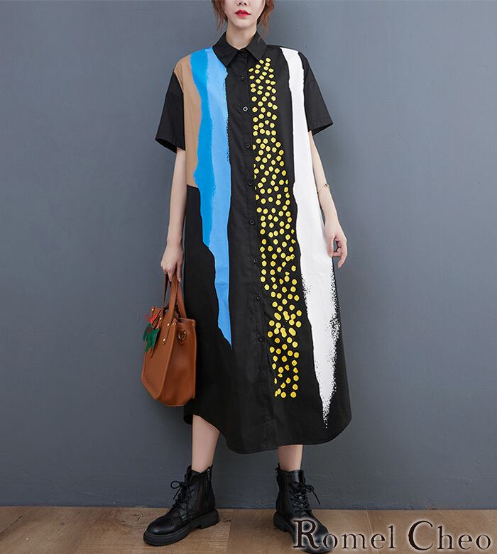 【お支払い確認後20日以内発送】 RomelCheo レトロプリントストライプシャツワンピース デザインワンピ ロングワンピ シャツワンピ 半袖 プリント ライン ゆったりドット ゆったり レディース モード系 ファッション 原宿系 青文字系 個性的 カジュアル ファッション ロメルチェオ