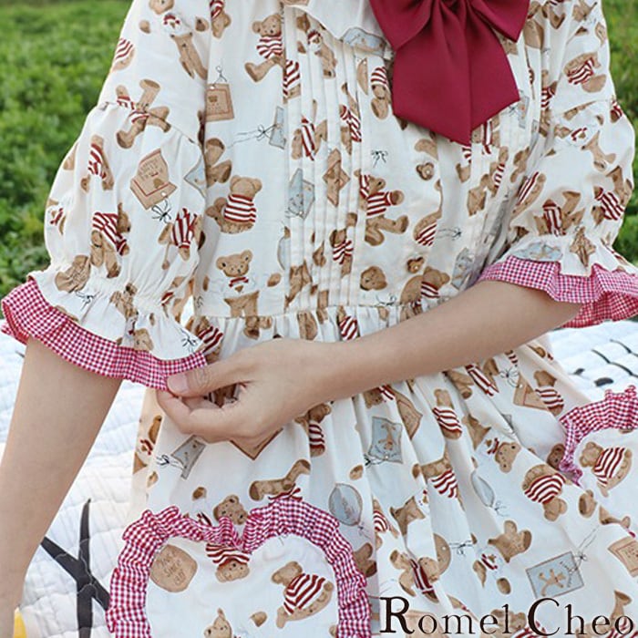 【お支払い確認後20日以内発送】 RomelCheo 甘ロリベアフリルリワンピース ロリータワンピ フリルリワンピ ハートワンピ 総柄ワンピ ゆったり 半袖 ひざ丈 ミディ丈 甘ロリ スウィートロリータ レディース モード系 ファッション 原宿系 青文字系 個性的 カジュアル ファッション ロメルチェオ