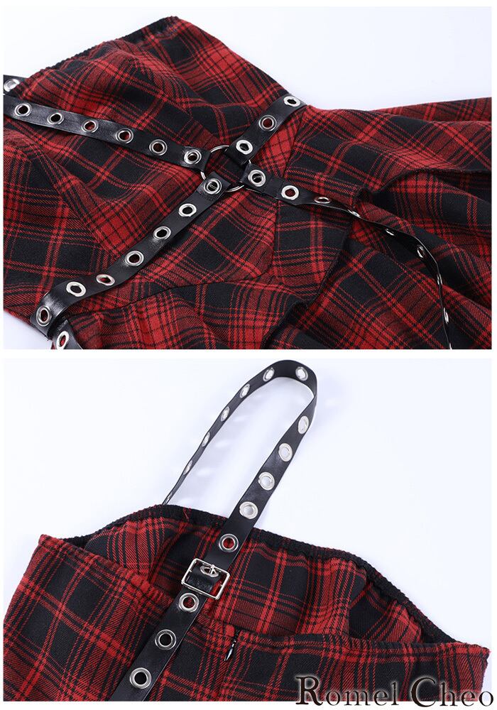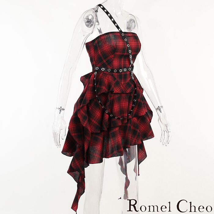 【お支払い確認後20日以内発送】RomelCheo パンキッシュチェックワンピース チューブトップワンピ ノースリーブワンピ ハイウエストワンピ チャックワンピ デザインワンピ Aライン ミニ丈 フェミニン パンク レディース 個性的 原宿系 青文字系 カジュアル ファッション ロメルチェオ