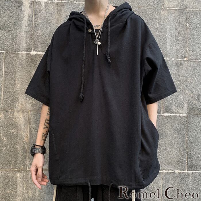 【お支払い確認後20日以内発送】RomelCheo ヒップホップビッグシルエット半袖パーカー オーバーサイズパーカー ルーズシルエット ドロップショルダー ゆったり ルーズシルエット モノトーン メンズ モード系 ストリート 個性的 原宿系 青文字系 サロン系 カジュアル ファッション ロメルチェオ