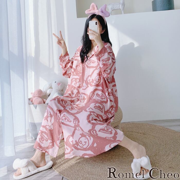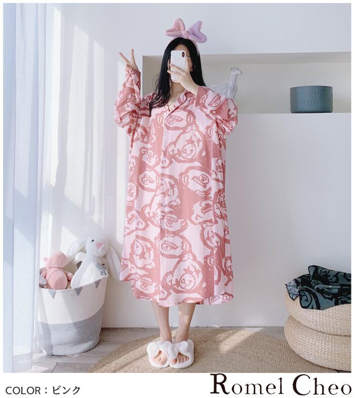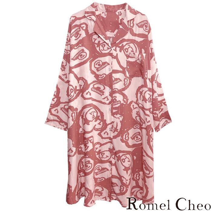 【お支払い確認後20日以内発送】RomelCheo 原宿系落書きクマロングシャツパジャマ ロングパジャマ ルームウェア ホームウェア 寝巻 クマ柄 総柄パジャマ オーバーサイズ ゆったり 長袖 リラックスウェア レディース 個性的 原宿系 青文字系 カジュアル ファッション ロメルチェオ