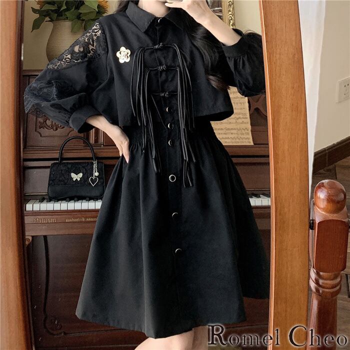【お支払い確認後20日以内発送】RomelCheo 腕レース シャツワンピ ブラック 襟付きワンピース ロングワンピ ボリューム袖 レース袖 フリンジワンピ ひざ丈ワンピ モノトーン 無地 レディース モード系 ストリート サロン系 個性的 原宿系 青文字系 カジュアル ファッション ロメルチェオ