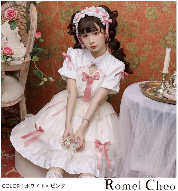 【お支払い確認後20日以内発送】RomelCheo 華ロリチャイナリボンワンピース ロリータワンピ ミニ丈ワンピ チャイナボタンワンピ ひざ上丈 ハイウエスト ゆめかわいい 病みかわいい ゴス クラロリ レディース モード系 ファッション 原宿系 青文字系 カジュアル ファッション ロメルチェオ