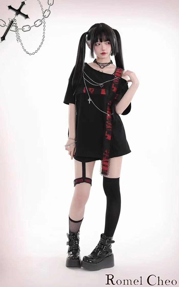【お支払い確認後20日以内発送】RomelCheo 黒赤十字ストラップレスルーズTシャツ アシンメトリーネックTシャツ デザインTシャツ オフショル アシメTシャツ ダークファッション 半袖 パンク ロック レディース モード系 ファッション 原宿系 青文字系 カジュアル ファッション ロメルチェオ
