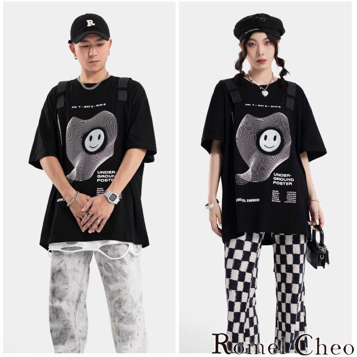 【お支払い確認後20日以内発送】RomelCheo スマイルベルト半袖Tシャツ グラフィックTシャツ デザインTシャツ ゆったり 半袖 モノトーン メンズ レディース ユニセックス モード系 ストリート ファッション 原宿系 サロン系 青文字系 カジュアル ファッション ロメルチェオ